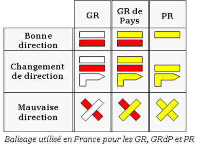 - Les PR : les chemins de Petite Randonnée (ou Promenade et Randonnée) sont balisés le plus souvent par la couleur jaune et en vert pour indiquer les jonctions possibles entre eux . Dans certaines régions un code couleur est utilisé suivant la durée des marches. Ce sont des itinéraires d'une durée maximale d'une journée.